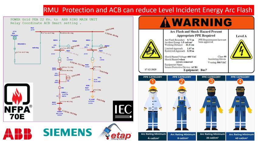 LVCB (MCCB and ACB) Trip Curve Selection, Fuse, ACB and MCCB Coordination, Air Circuit Breaker Setting (LT, ST and Instantaneous), CB for Motor Protection Coordination, Power System Transient Stability, Effect of BUS Fault in Generator, Transmission Lines Load Flow, Generator Capability Curve, Generator Loss of Excitation (LOE), Anti - Islanding Mode with FREQ and VOLT relays and Short-Circuit Analysis based on ANSI C37 and IEC 61363 for Offshore (3) หลักสูตรอบรม ETAP 3 : Relay Setting and Design, Arc Flash and Arc Fault รอบอบรม 20 - 21 January 2026